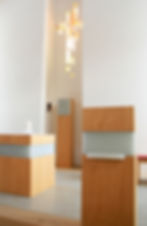 Gestaltung und Planung des Kirchenmobiliars der Kirche in Regenhütte (bay. Wald), Altar, Ambo, Taufbecken, Tabernakel, Sedilien, ewiges Licht, Kerzenleuchter und Weihwasserbecken